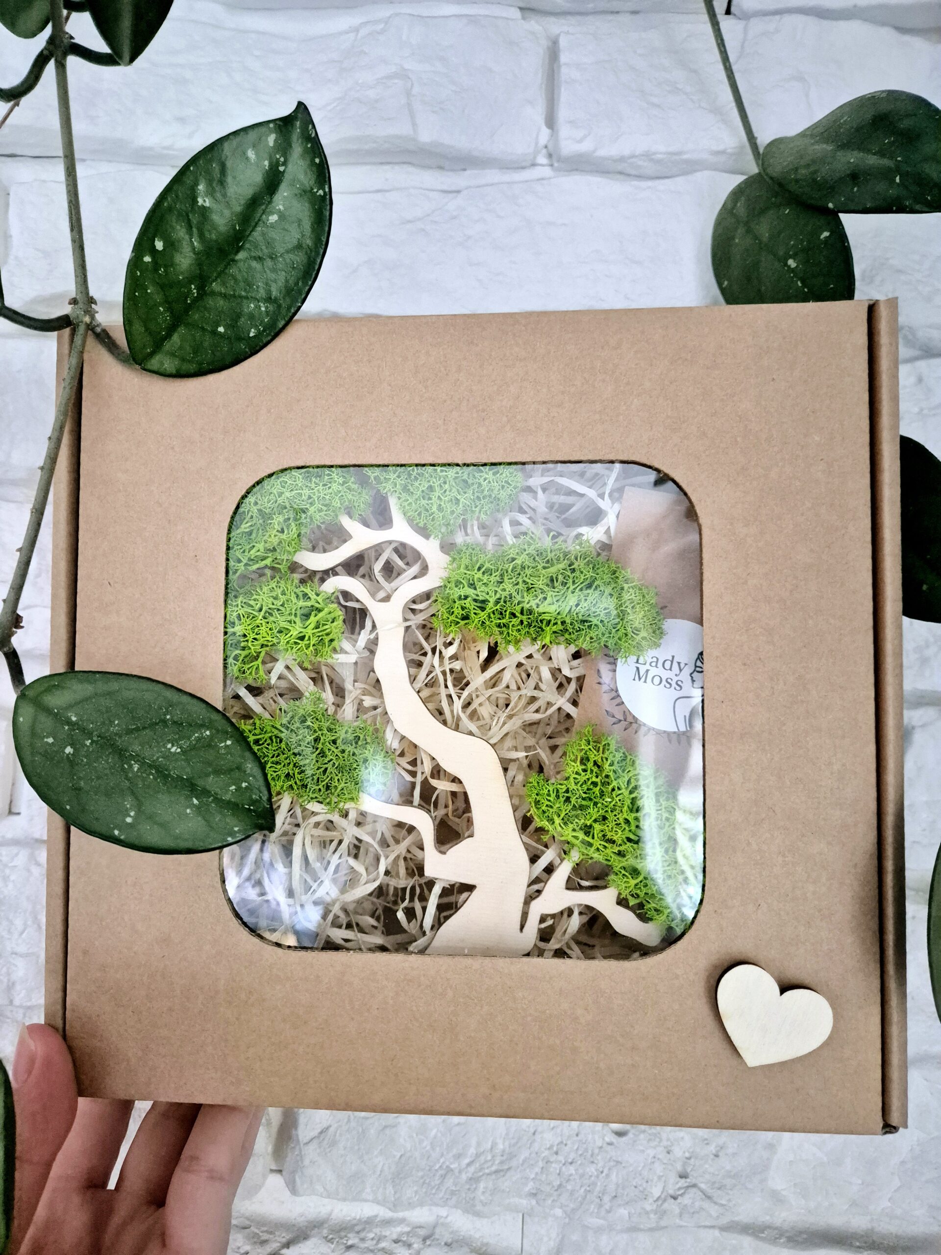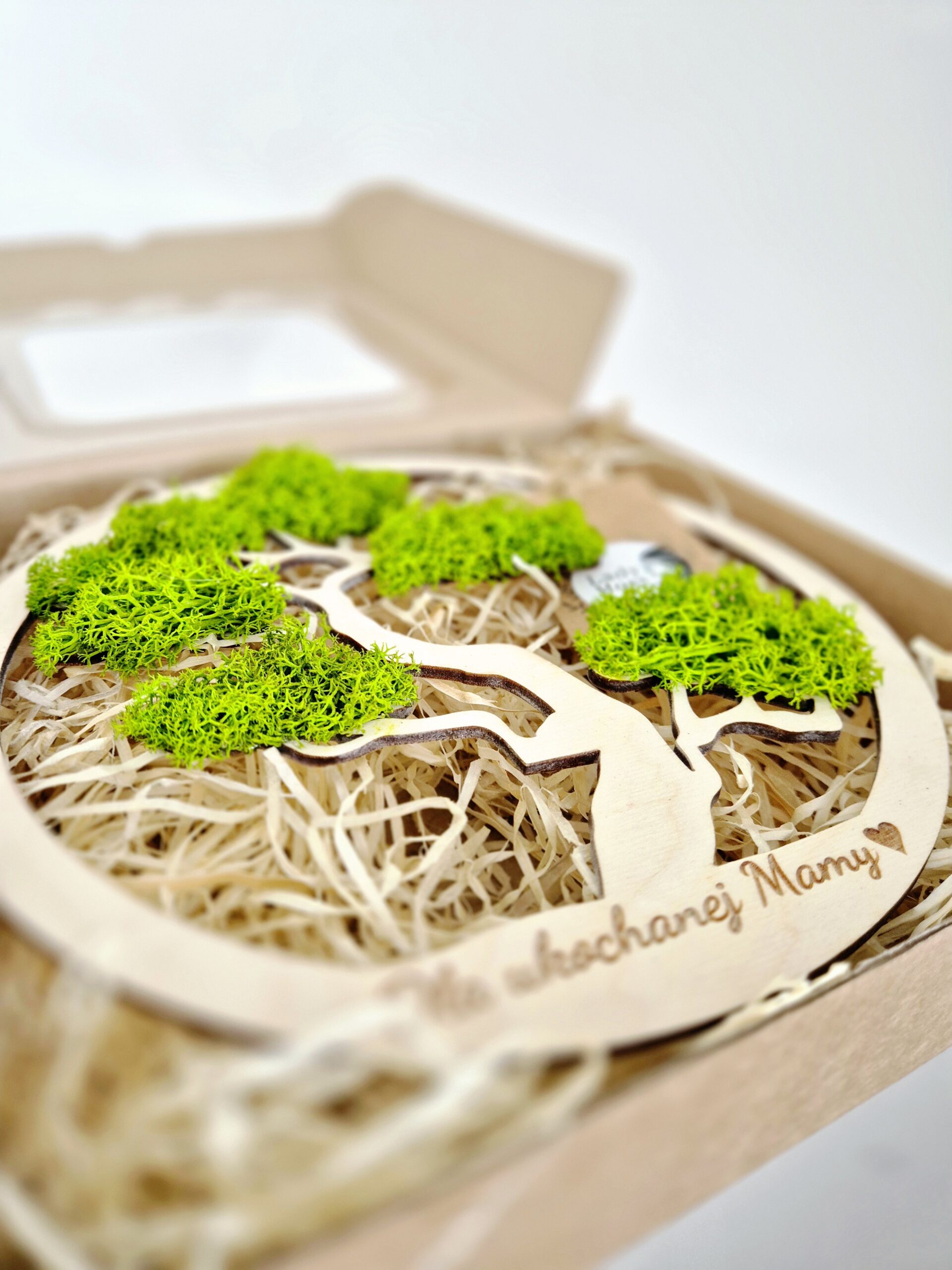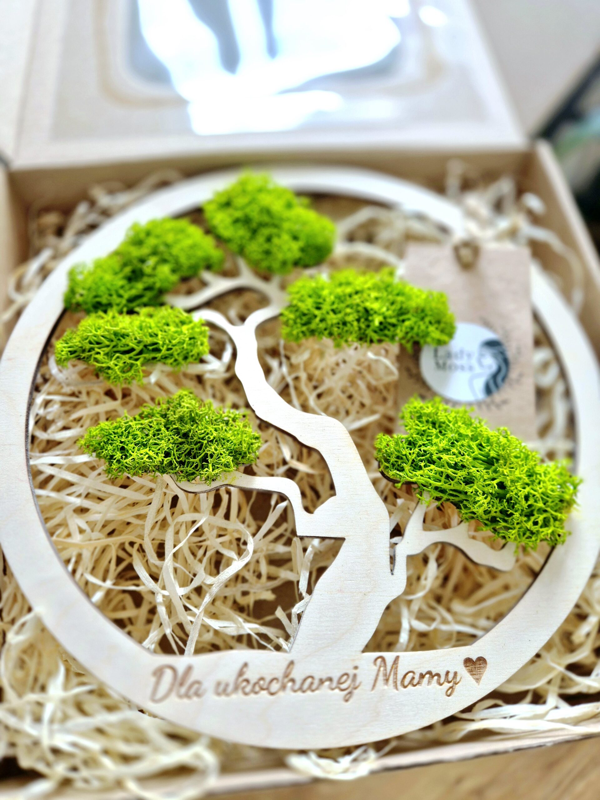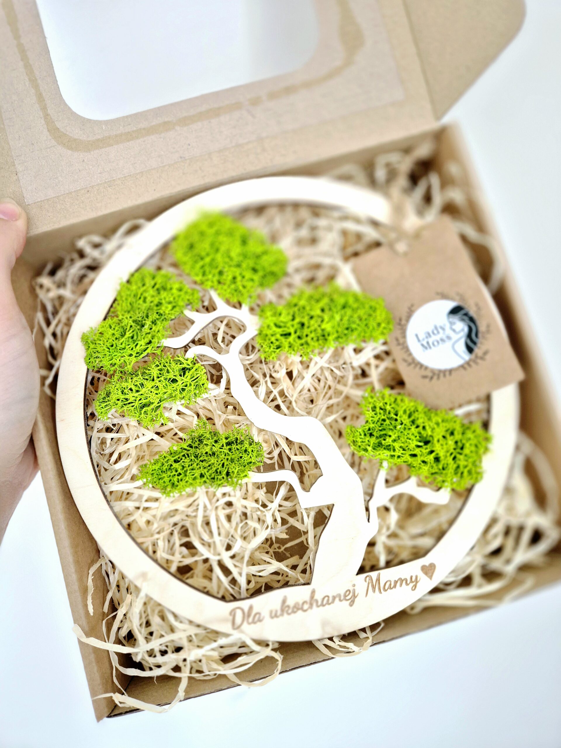 Bonsai, czyli sztuka hodowli miniaturowych drzewek, od wieków symbolizuje harmonię, równowagę i ciągły rozwój. Drzewko bonsai z chrobotkiem reniferowym to połączenie tej japońskiej tradycji z naturalnym pięknem chrobotka. Jego spokojna, zielona barwa przywołuje obraz lasu, spokoju natury i harmonię, którą tak bardzo ceni każda kobieta. Z każdym dniem drzewko staje się coraz bardziej osobiste, jak wspólna podróż z mamą – pełna wspomnień, miłości i wzajemnego wsparcia.