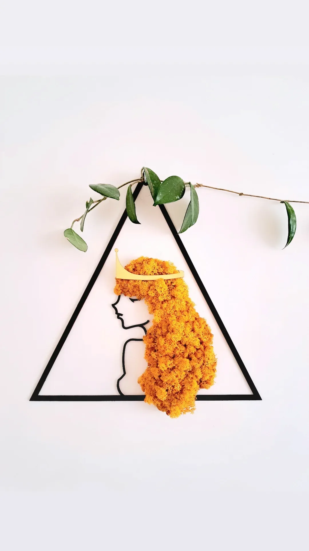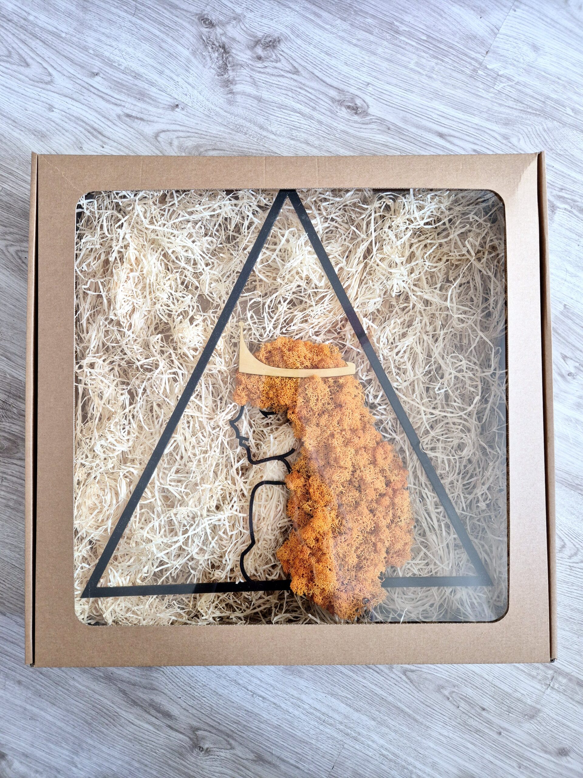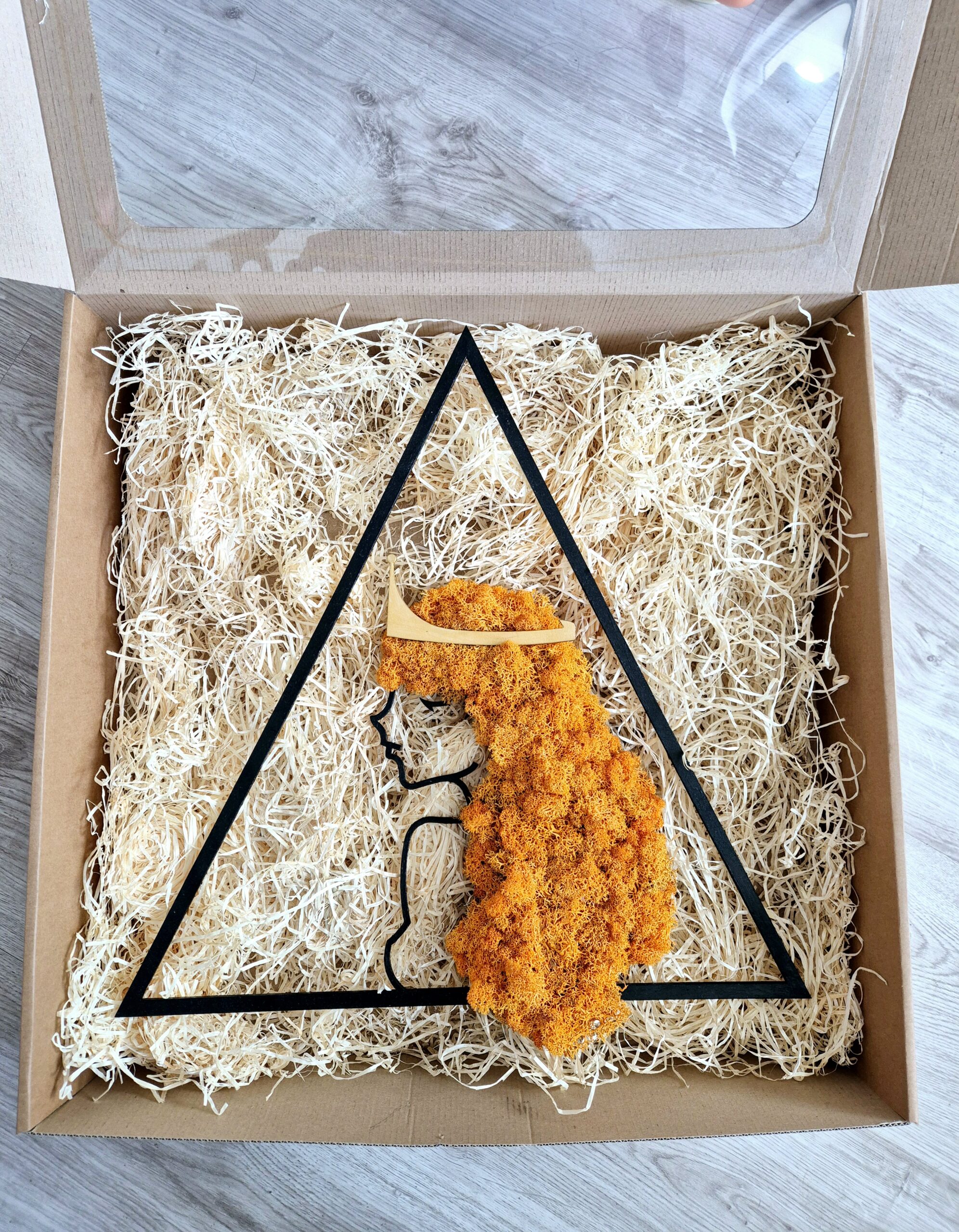 Lady Lion – obraz z chrobotka reniferowego to wyjątkowa dekoracja ścienna inspirowana znakiem zodiaku Lew. Przedstawia kobietę z ognistymi, pomarańczowymi włosami z naturalnego chrobotka i złotą koroną na głowie – symbol siły, odwagi i kobiecej energii. Część Zodiakalnej Kolekcji Kobiecej, idealna do wnętrz pełnych charakteru i pasji. Trwały, ekologiczny, bezobsługowy.