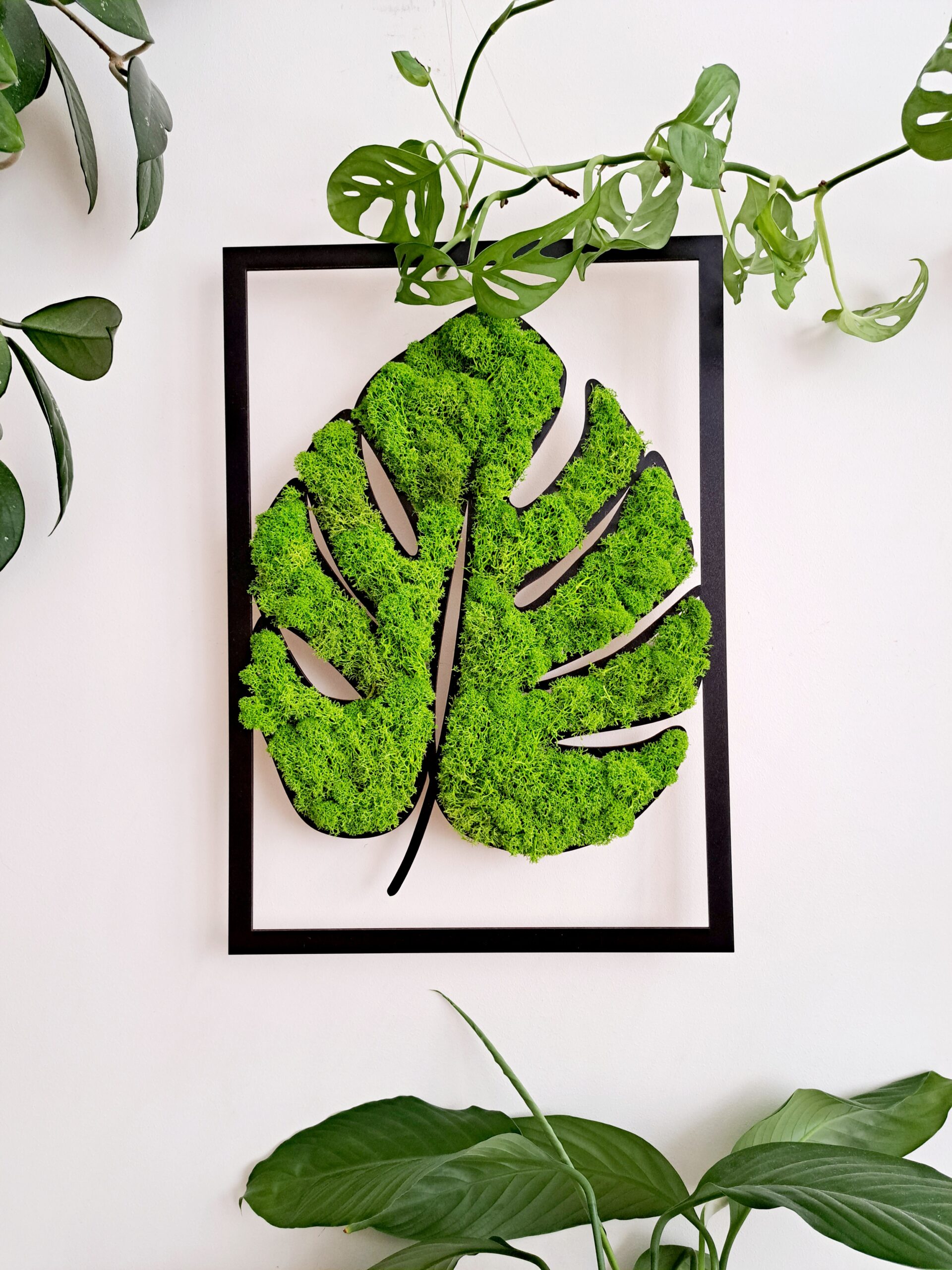 Szukasz oryginalnej dekoracji, która łączy naturę z nowoczesnym designem? Liść monstery w formie obrazu z naturalnym chrobotkiem reniferowym przyciąga wzrok i wprowadza do wnętrza świeżość. Co więcej, jasnozielony mech dekoracyjny pięknie kontrastuje z czarną ramą, dlatego całość wygląda elegancko i ponadczasowo.