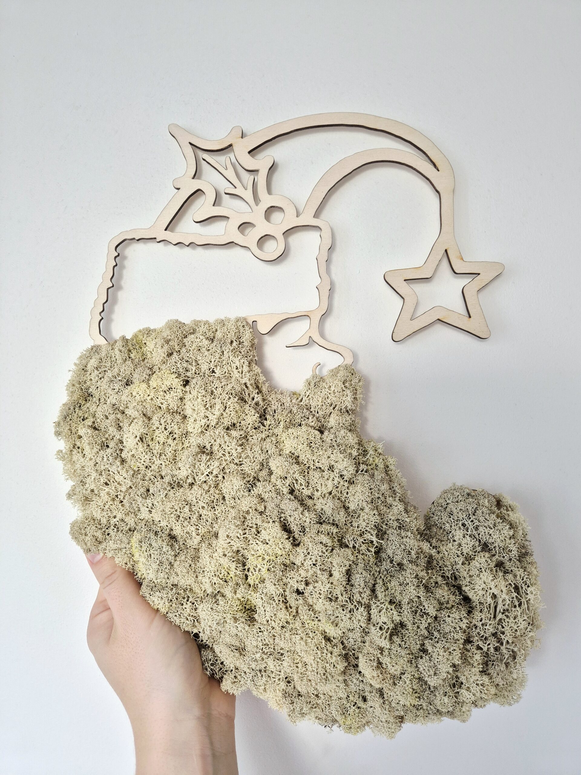 Dolna część dekoracji to broda Mikołaja. Została ręcznie wypełniona jasnym chrobotkiem reniferowym w kolorze beżowym, który nadaje dekoracji wyjątkową fakturę i naturalny charakter. Całość doskonale sprawdzi się jako ozdoba na ścianę, drzwi, półkę lub element świątecznych kompozycji. To świetny pomysł na prezent oraz unikalny dodatek, który przyciąga wzrok.