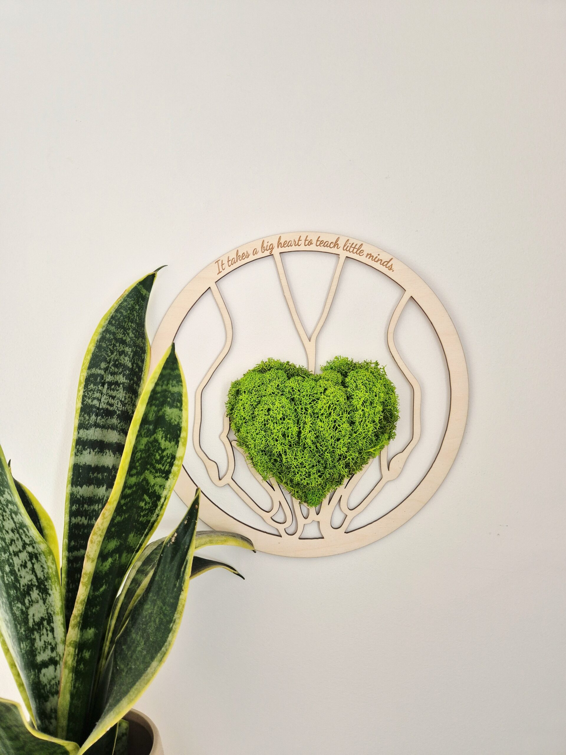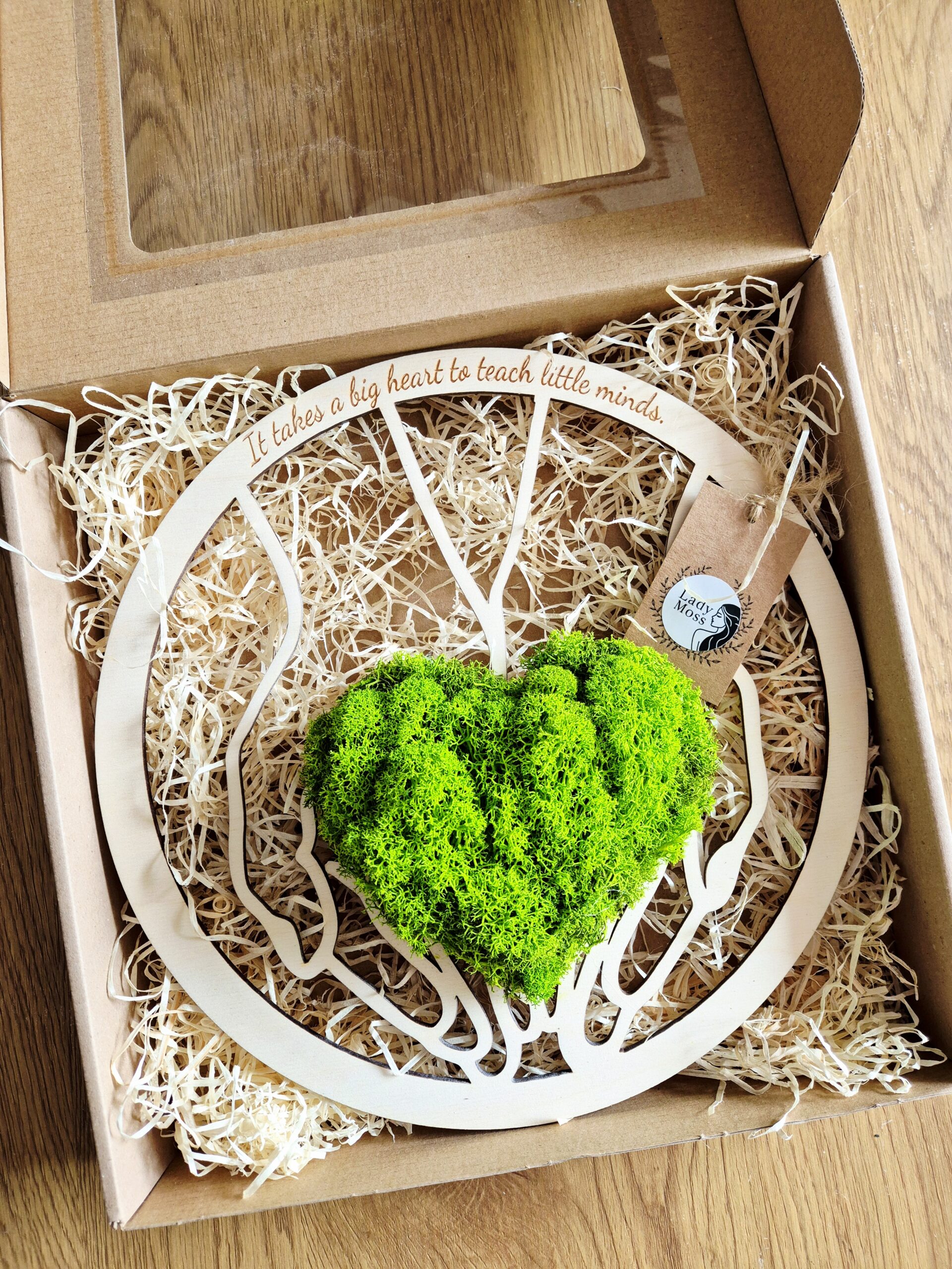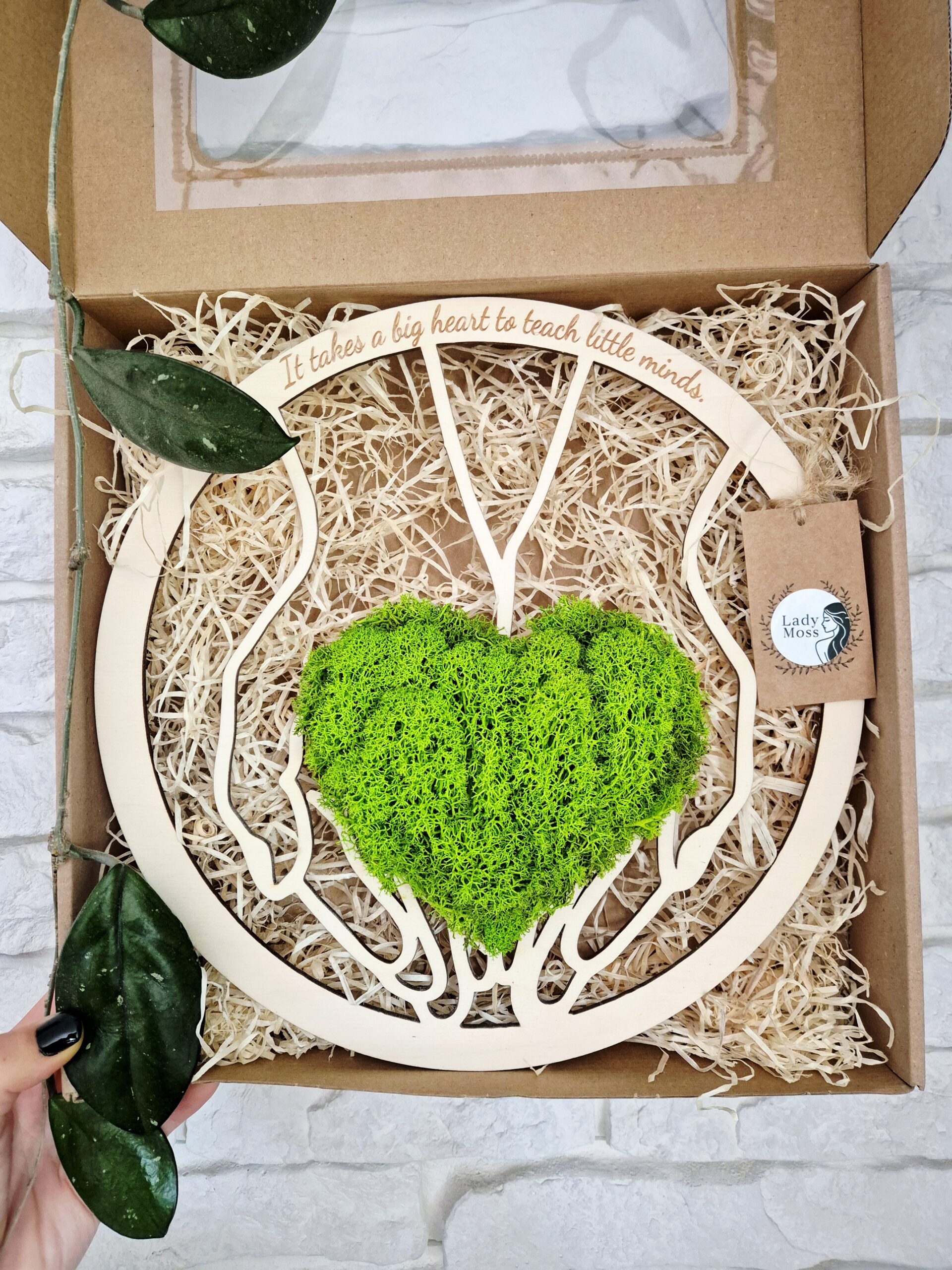 Wyjątkowa dekoracja z chrobotka – zielone serce w dłoniach z napisem „It takes a big heart to teach little minds”. Idealny prezent dla nauczyciela angielskiego na zakończenie roku lub Dzień Nauczyciela.
