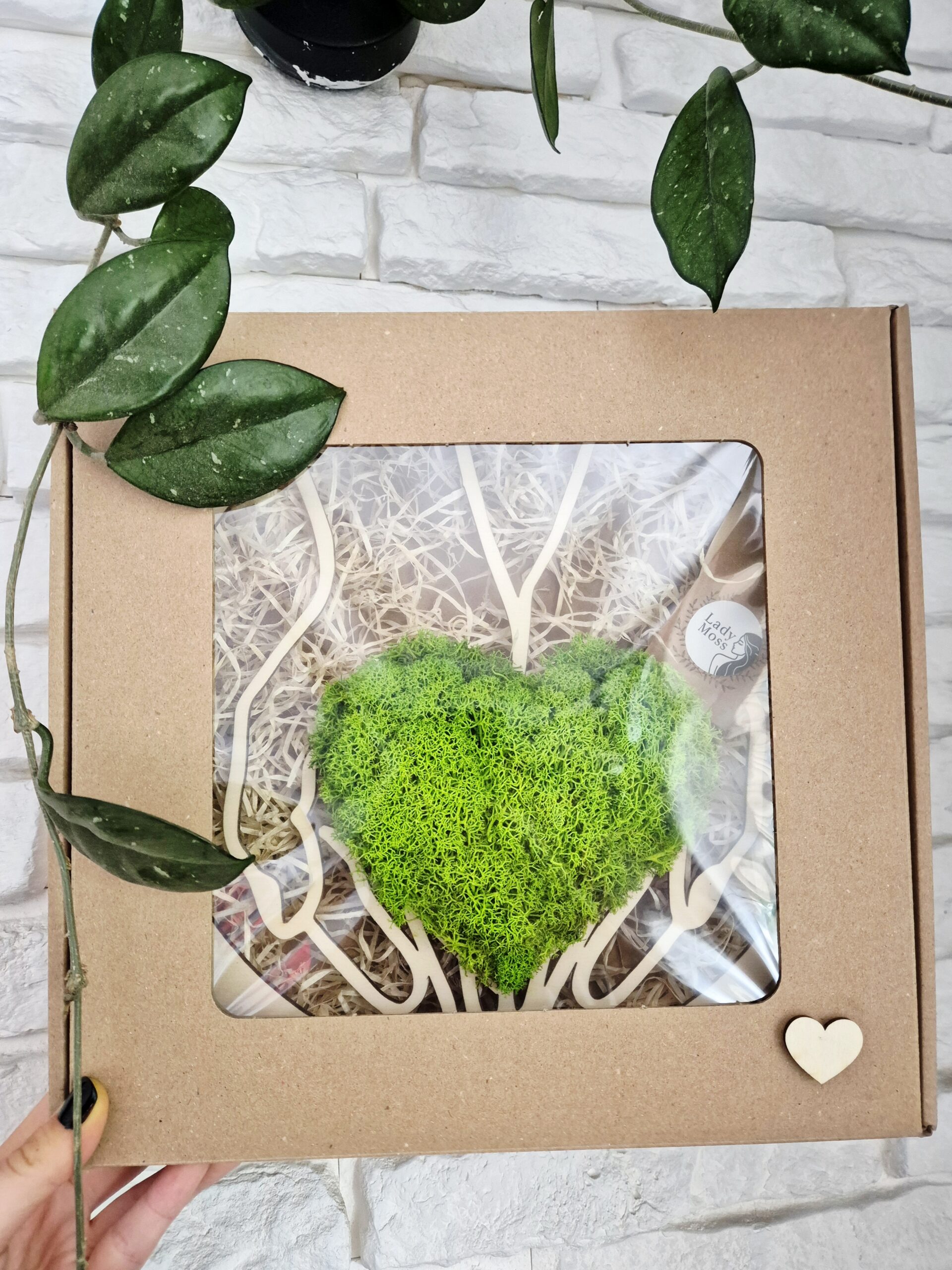W centralnym punkcie kompozycji znajduje się zielone serce z chrobotka, symbolizujące wdzięczność i zaangażowanie. Ułożone jest ono na symbolicznych dłoniach, zamkniętych w eleganckiej drewnianej obręczy o średnicy 30 cm, z wygrawerowanym napisem w języku angielskim: